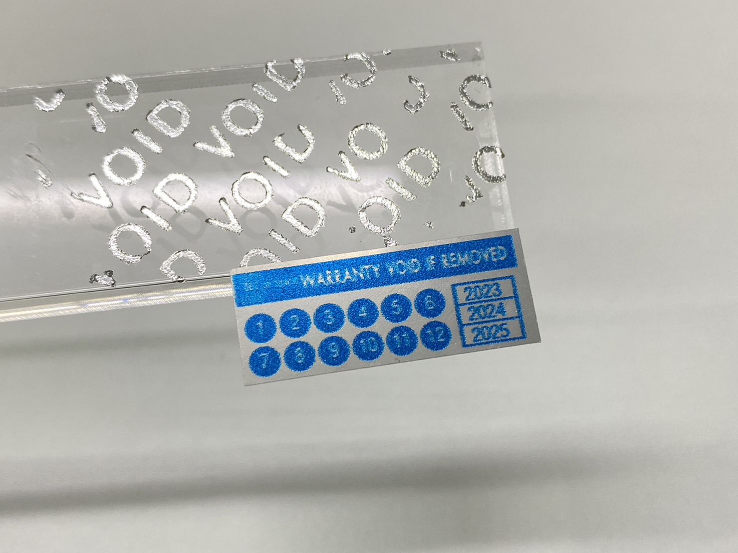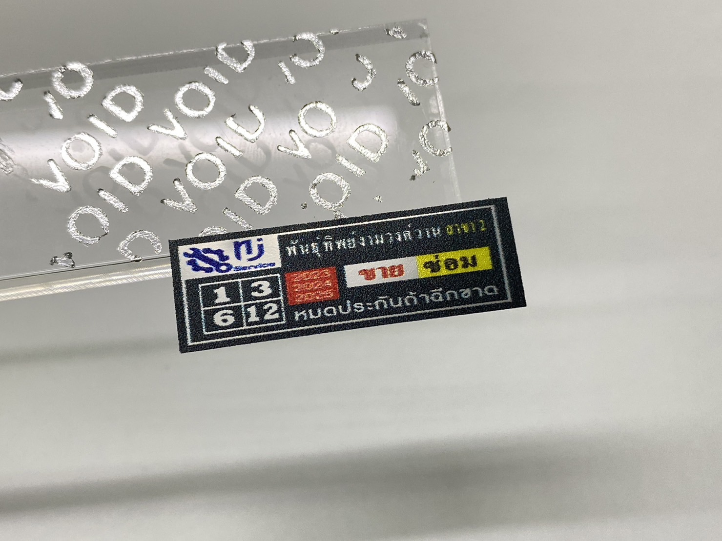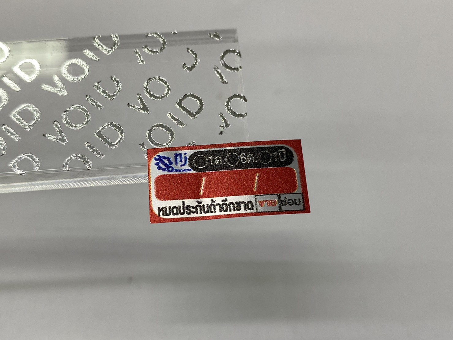 - ควรทำการทดสอบก่อนใช้งานจริง โดยติด สติ๊กเกอร์วอยด์เงิน ลงบนพื้นผิวและลองดึงออก เพื่อดูว่าทิ้งร่องรอยหรือไม่